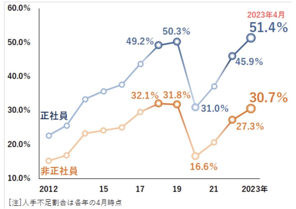 社員が「不足している」と感じている企業の割合が、過去最大の水準に戻ってきている。