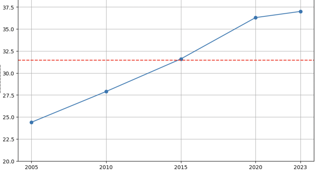 非正規社員の割合は、2005年に約24%だったのが、2023年には37%に達しています。