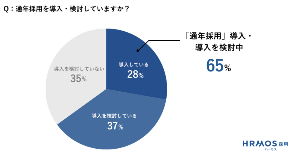 下のデータが示すように、通年採用を実施している企業の割合は、検討中を含めると65%にも達します。
