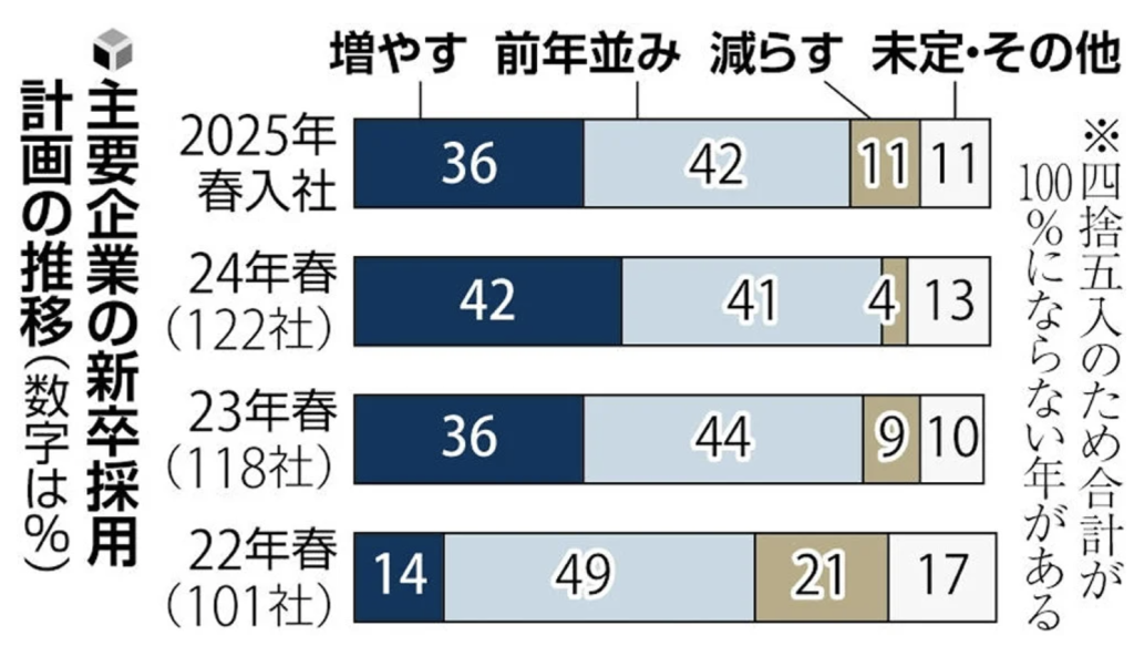 実際に最新のデータによると、25卒の新卒採用について、主要企業の約40%が新卒採用者数を増やすと回答しています。
