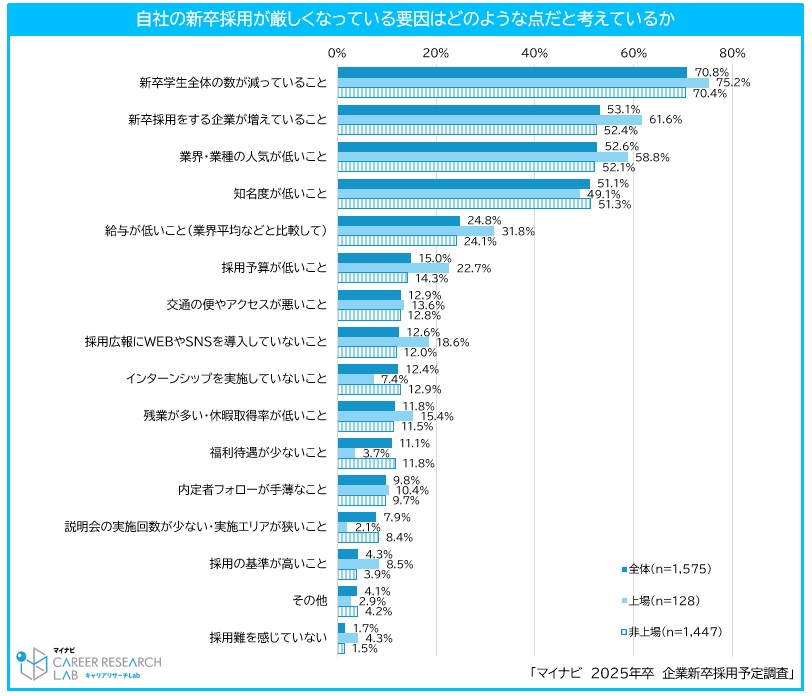 実際にマイナビの調査によると、「新卒採用が厳しくなった要因」を企業に質問したところ、「新卒学生全体が減っていること」という回答が最も多くなりました。