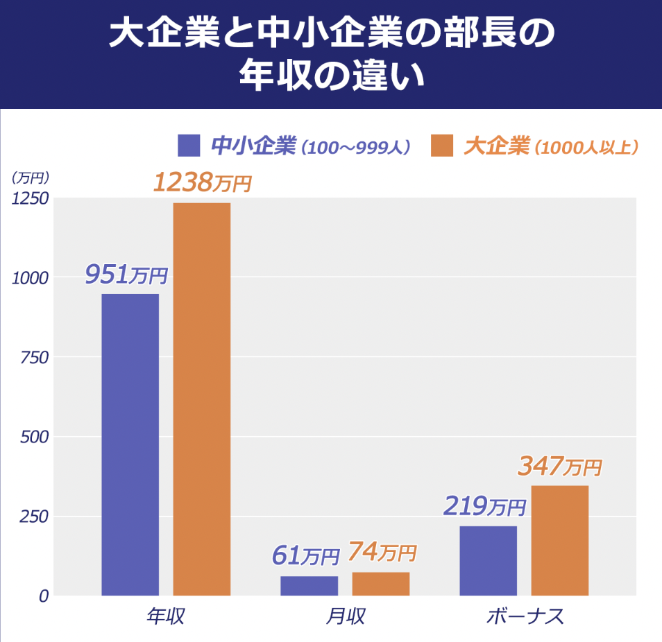 さらに、部長クラスになると企業規模が違うだけで、年収が300万円以上開いてしまうのです。