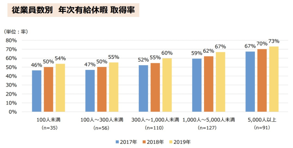 以下の図でわかることですが、企業規模が大きくなるほど、有給休暇の取得がしやすくなることがわかります。