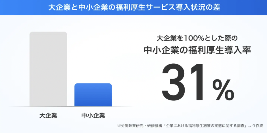 データによると、中小企業の福利厚生導入率は、大手企業の3分の1ほどであり、あまり整っていないことがわかります。
